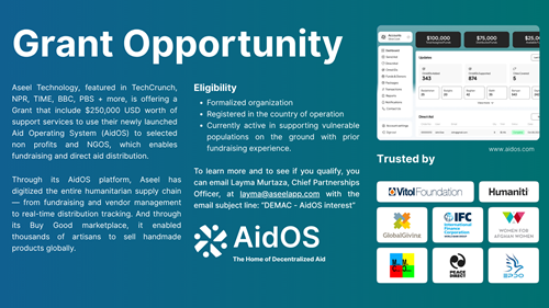 Aseel Technology featured in TechCrunch, NPR, TIME, BBC, PBS and more, is offering a limited amount of grants for $250,000 worth of support services to use their newly launched Aid Operating System (AidOS) to selected non profits and NGOS, which enables fundraising and direct aid distribution.